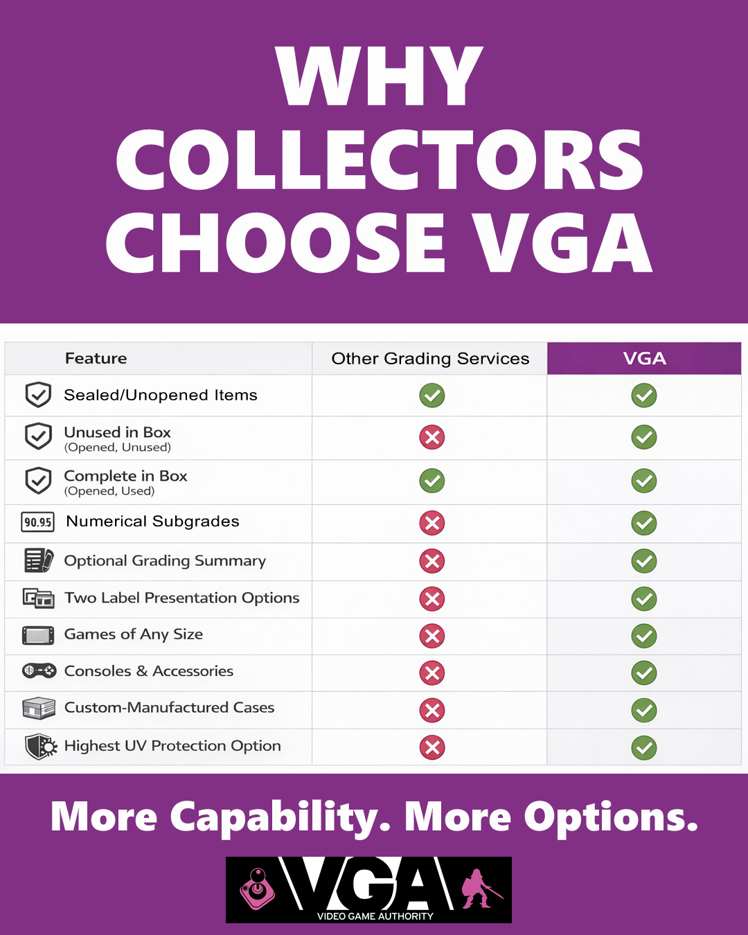 VGA now offers a Unified 10-Point Grading Scale alongside our existing Standard 100-Point Scale. The Unified Grade provides collectors with an additional presentation option that aligns with grading formats commonly used for trading cards, comics, and other pop culture collectibles, while maintaining VGA’s established and consistent grading standards.